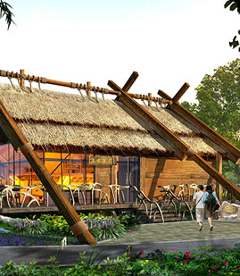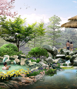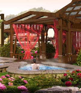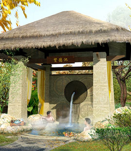 户外温泉建筑面积约15000平方米,以生态自然、休闲养生为特色,小桥流水,亭台楼榭,清溪潺潺,花果飘香;雾雨时节,烟霞缥缈,山色苍苍,湖水茫茫;置身其中,宛若蓬莱。